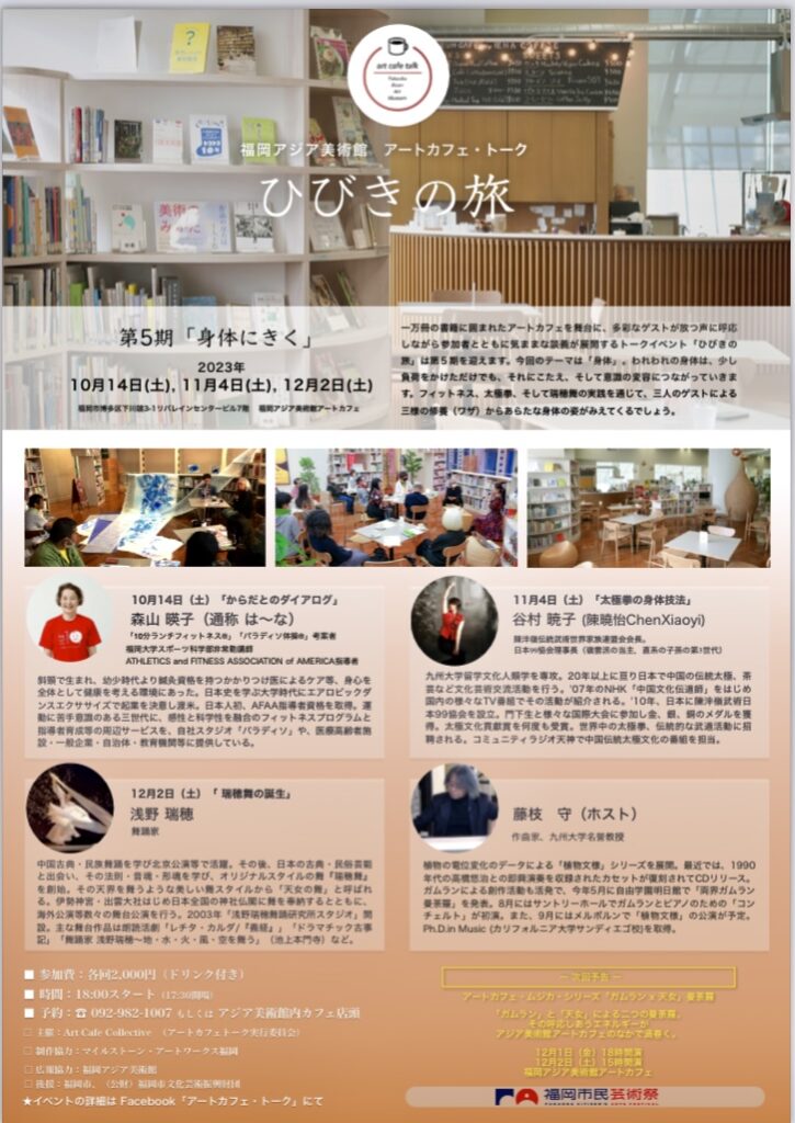福岡アジア美術館アートカフェ•トーク 2023年7月21日 最終更新日時 : 2023年7月21日 love33 第5期 ひびきの旅 2023年11月4日(土) トークイベント「太極拳の身体技法」 谷村暁子 陳曉怡 Chen Xiaoyi 参加費: 2,000円(ドリンク付き) 時間: 18:00スタート(17:30開場) 予約: 092-982-1007もしくはアジア美術館カフェ店頭 主催: Art Cafe Collective(アートカフェトーク実行委員会) イベントの詳細はFacebook:「アートカフェ•トーク」にて \ 最新情報をチェック /