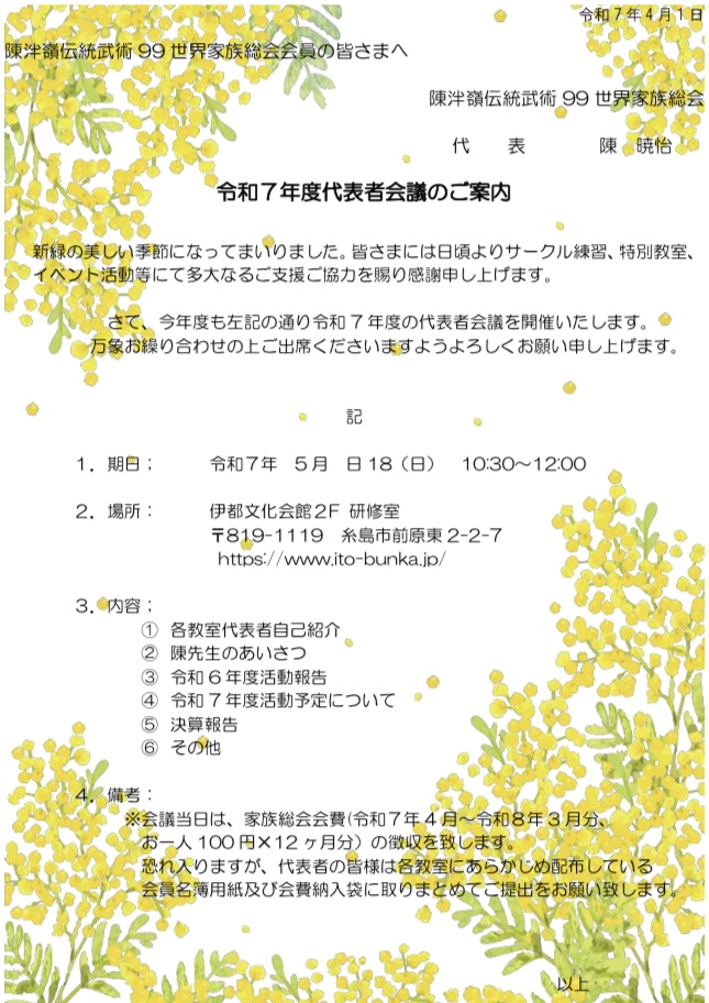 💁♀️代表者会議開催🎏 2025年5月19日 最終更新日時 : 2025年5月19日 love33 昨日18日日曜日に令和7年度代表者会議が開催されました🤗 May 18, 2025 Sunday 10:30〜12:00 伊都文化会館/ 研修室 Screenshot \ 最新情報をチェック /